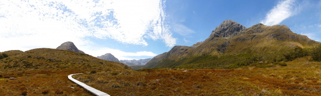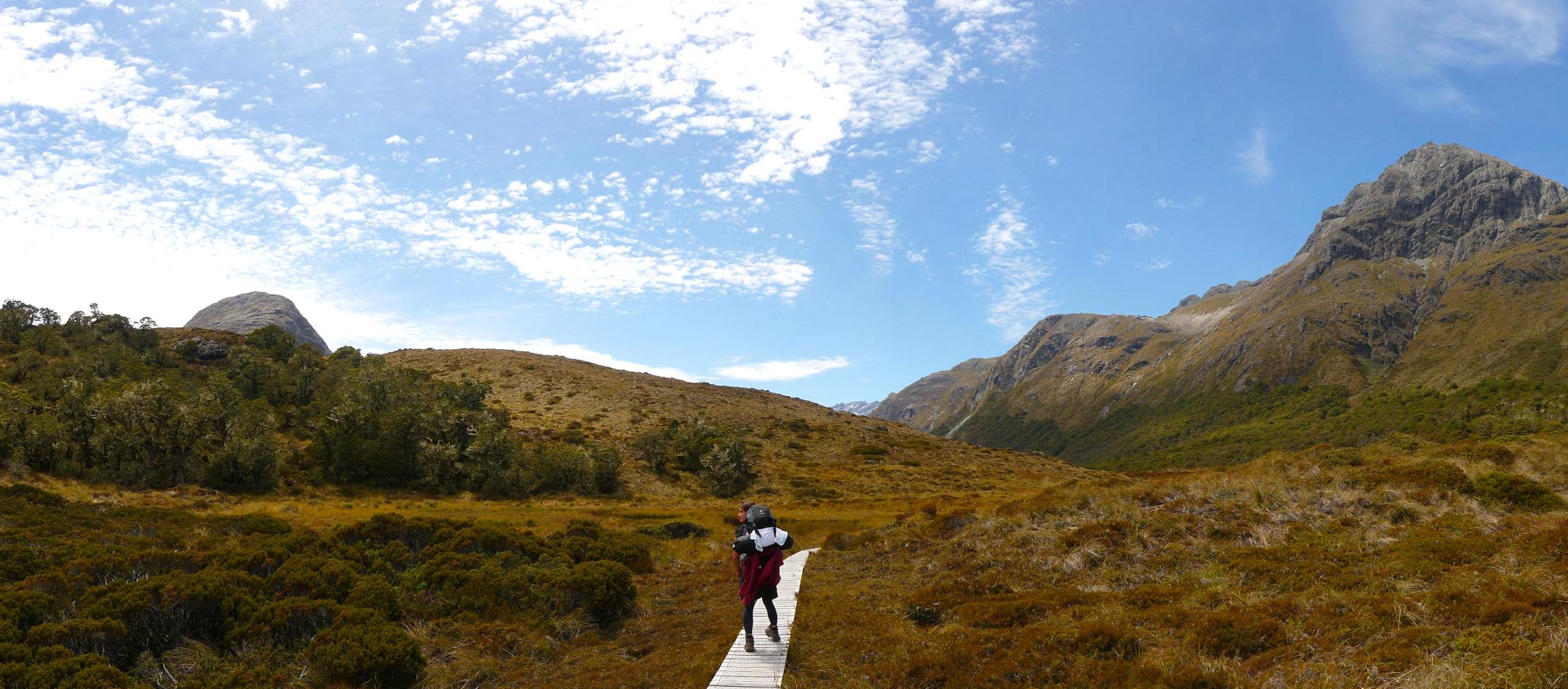 The walk along the saddle still brought changing scenery. After a bit, the peaks in the distance came into view.