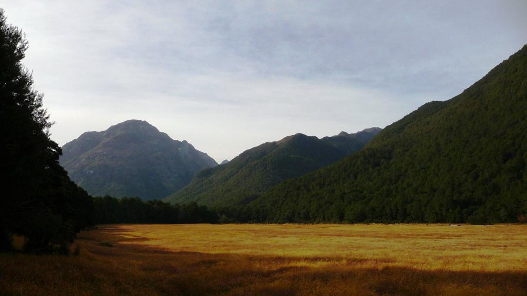 Which was a good thing. This was the day we were hiking across the McKellar Saddle – the highest point of the track, and also the day with far and away the most significant ascent and descent. The saddle, which would end up being way up on the left hand side of the next picture.