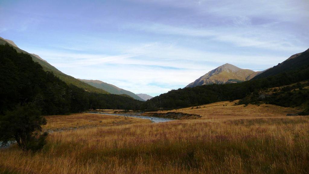 We didn’t quite make it to the next hut, but decided to camp here, off the track. On the Greenstone-Caples tracks, you are allowed to camp 50 meters off the track, by the bushline (just off to the right in this picture), for free. Neither of us had planned to do so, but this was a lovely spot and we had been walking for quite a few hours by now.