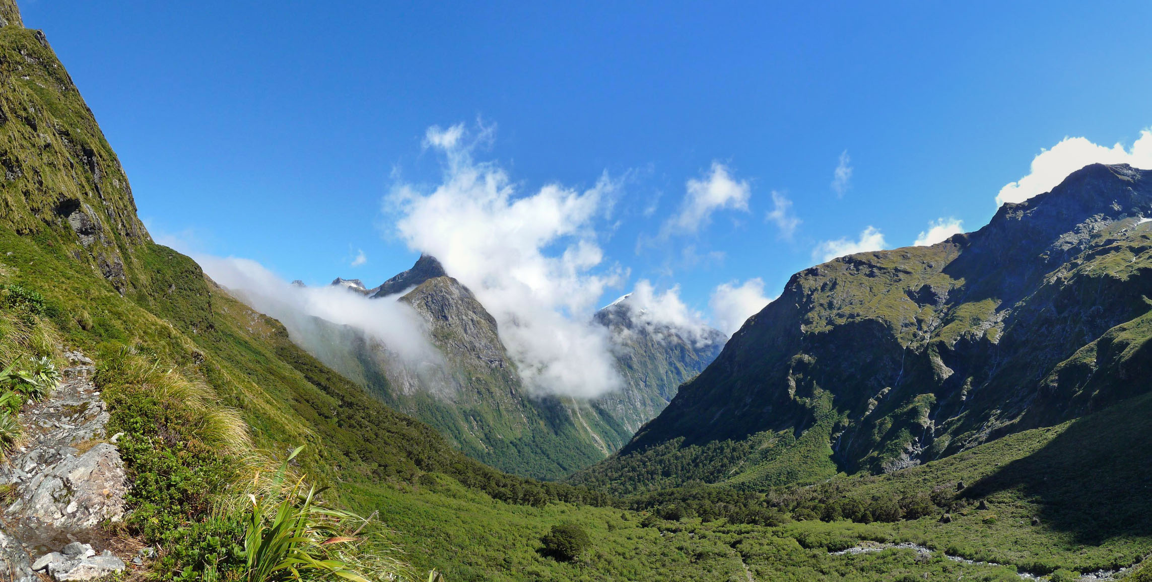 Having descended down the Arthur side quite a bit, the valley opened up in front of you. And on the left hand side, the MacKinnon Pass…still covered in cloud. I chose correctly it seems!